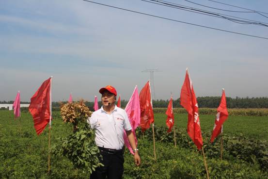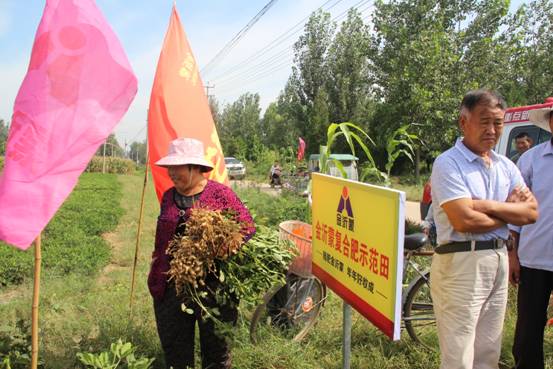 據了解,這片示范田所在的地塊土質較差,原來種植花生不僅長勢不好,還存在嚴重的死秧現象,導致產量低,收入少,本村的村民普遍不愿意種植。后來這片地被昊銳農機化種植專業合作社進行土地流轉集中管理,本季花生用肥采用了金沂蒙54%(18-18-18)復合肥+有機肥的套餐。施用之后,效果顯現,現在花生即將收獲,為了向附近村民展示金沂蒙復合肥的效果,金沂蒙聯合昊銳農機化種植合作社共同舉行了此次花生示范田觀摩會。