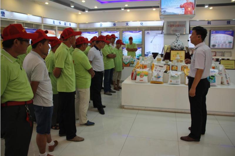 種植大戶一行先后參觀了金沂蒙集團展廳、生態肥料生產廠區和化工生產廠區。金沂蒙生態肥業魯南大區銷售經理李學昊向來賓詳細介紹了金沂蒙集團的發展歷程、企業文化、科技研發和產品體系,并在參觀廠區的過程中分別介紹了集團各個業務版塊的發展情況。