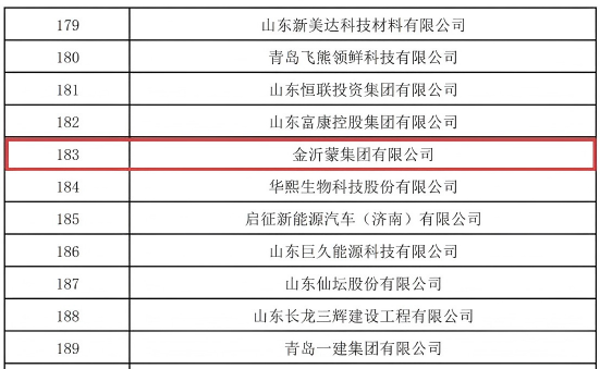 8月19日,2025山東民營企業百強系列榜單發布會暨第二屆臨商大會開幕式在臨沂市舉行,會議發布了“2025山東民營企業200強”榜單,金沂蒙集團有限公司位列榜單第183名。繼2024年入圍之后再次登榜,充分彰顯了金沂蒙在化工制造領域的穩健實力與區域經濟貢獻。