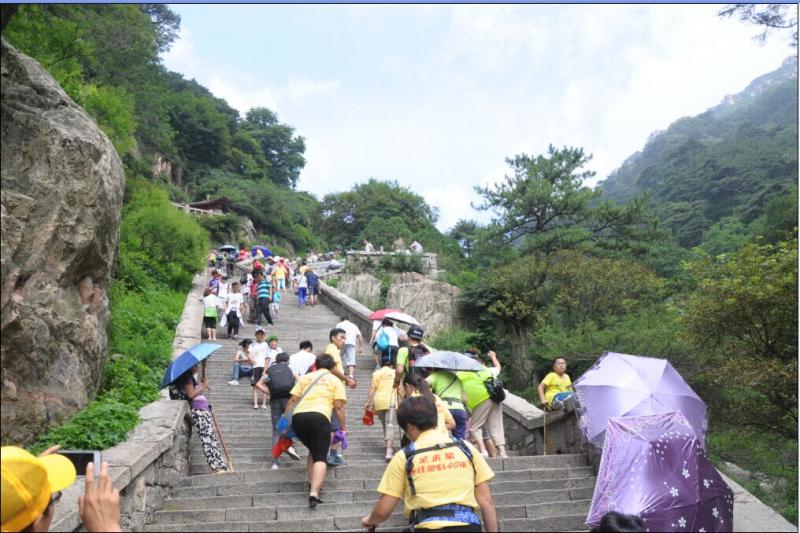 觀泰山之雄壯,賞風光之秀美。泰山地勢險峻,氣勢磅礴,但農資英雄們無所畏懼,勇敢攀登。山間雖涼風習習,登山者卻個個揮汗如雨,雖非常勞累,但不退縮、不放棄。在異常陡峭、貌似天梯的十八盤,有的游客望而卻步,金沂蒙農資英雄們卻你追我趕,奮勇向上,順利登上南天門和玉皇頂。天上艷陽高照,山頂煙霧繚繞,在清爽的山風中,風景盡收眼底,會當凌絕頂,一覽眾山小的豪邁回蕩胸間。